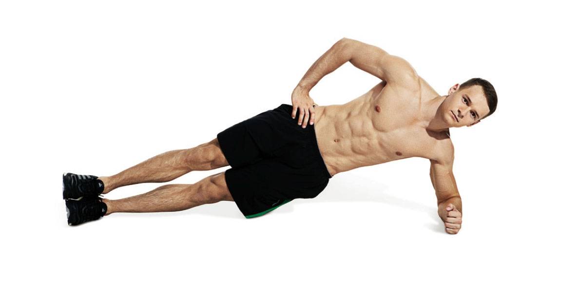 Начинаем с боковой планки. Заведи свободную руку под корпус. Вернись в первоначальное положение. Повтори упражнение на другую сторону.