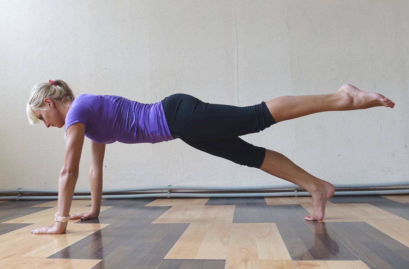 Схема выполнения этого упражнения похожа на предыдущую. Единственное отличие — вместо руки необходимо поднять ногу, выпрямленную в колене. Основной акцент делается на удержании тела в равновесии в течение нескольких секунд.