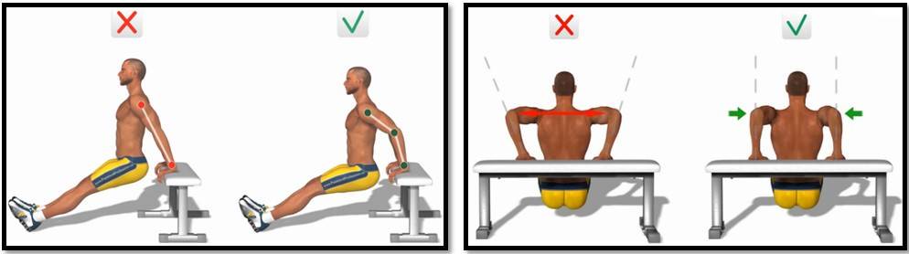 - и положение локтей (не разводите их в стороны, держите как можно ближе к корпусу). Выводя таз вверх и вперёд, Вы сокращаете амплитуду движения и уменьшаете нагрузку на трицепс. При разведении локтей в стороны в работу включаются широчайшие мышцы спины, к тому же Вы рискуете получить травму в плечевых суставах.