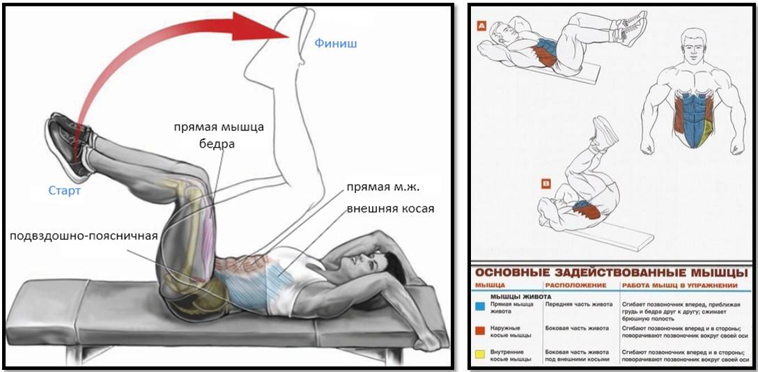 Чтобы полностью и равномерно нагрузить прямую мышцу живота, рекомендуется на одной тренировке комбинировать скручивания с подъемом ног
