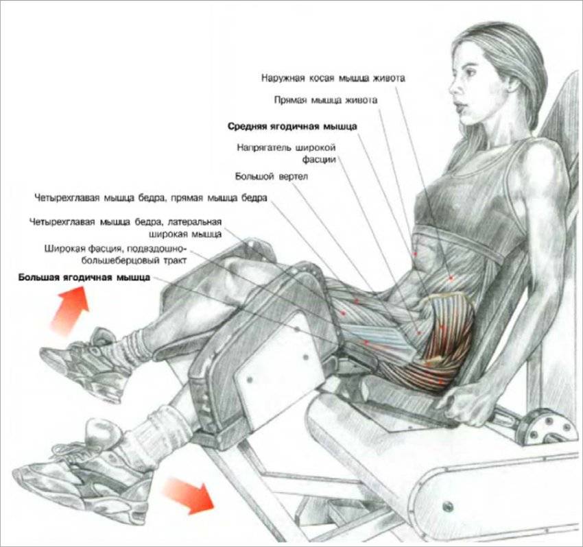 Многие девушки встают на «педали» тренажера ногами, разводят ноги, и одновременно опускают таз в подобие приседа, а затем встают в стойку. Это упражнение дополнительно задействует бицепс бедра и квадрицепс, и помогает придать тонус мышцам ног. Но оно не может заменить классическое приседание со штангой или гантелями, и не должно использоваться как основное. Это движение может быть четвертым-пятым упражнением в программе, либо использоваться как предварительное утомление или разминка перед тяжелым приседанием. Ягодичные мышцы – сильные, и проработать их подобными упражнениями до результата не получится.
