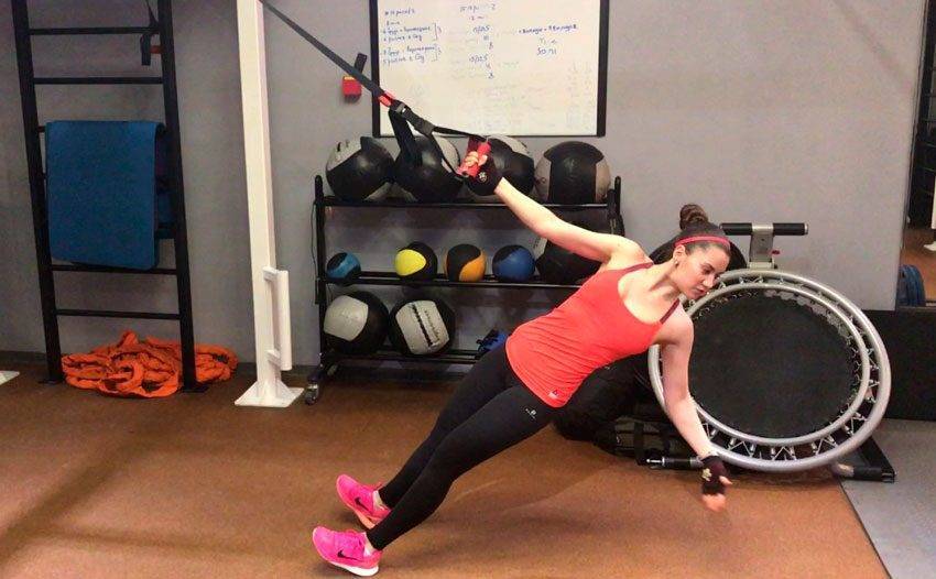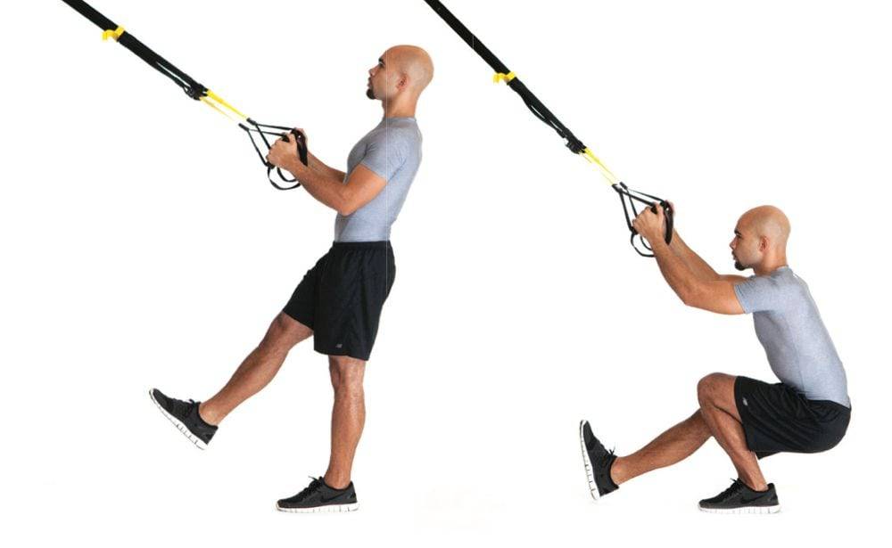 Становятся спиной к снаряду и помещают одну ногу в обе петли, а на другую делают полный присед. Это движение отлично прорабатывает ноги и торс.