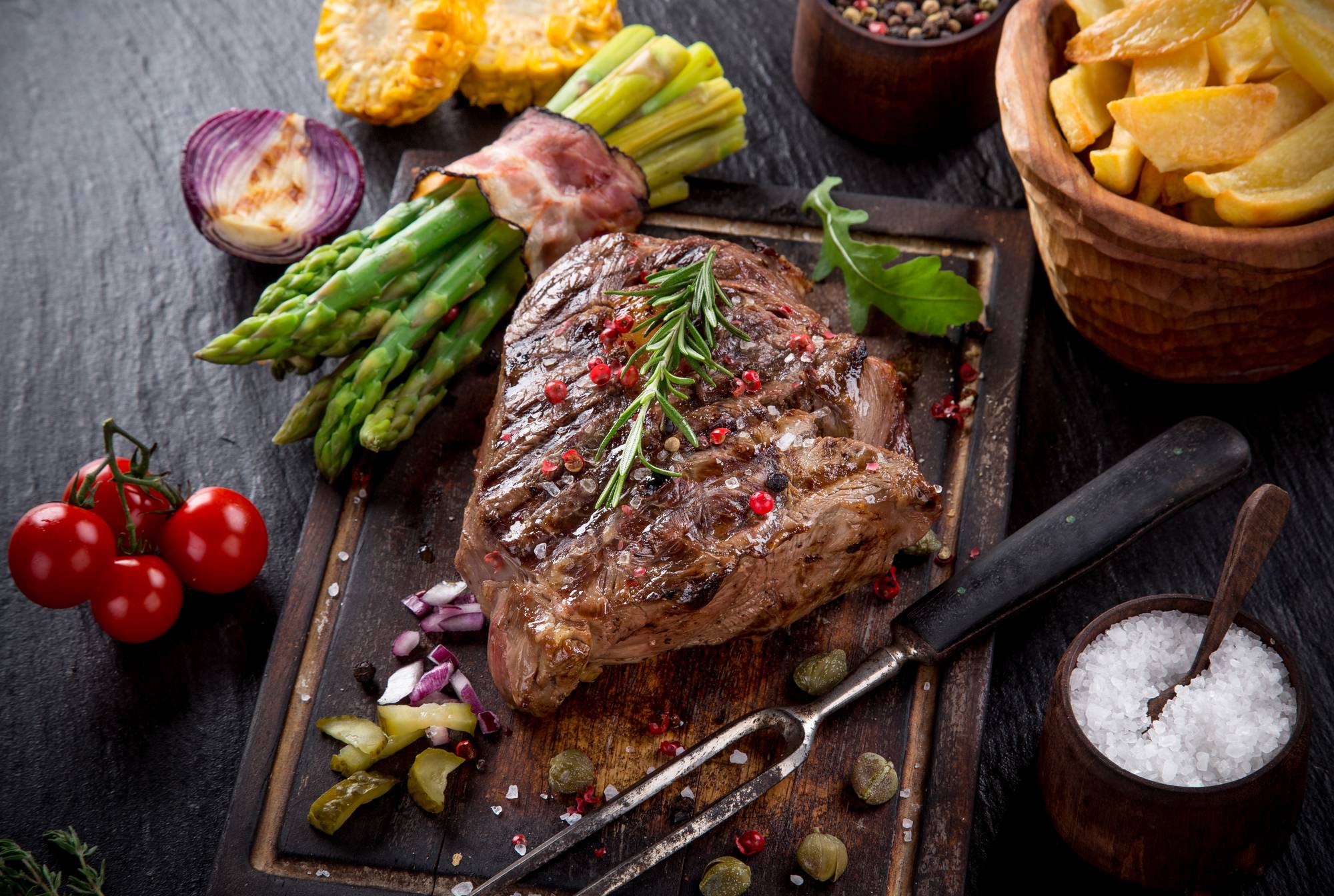- Обед: Ломтики свиной вырезки с жареным чесночным картофелем и стручковой фасолью.