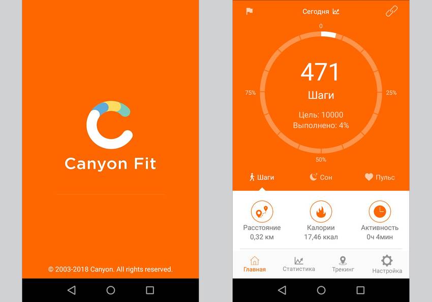 Перед началом работы на ваш смартфон обязательно нужно установить официальное приложение Canyon Fit. Оно бесплатное и поддерживается iOS и ОС Android. Canyon Fit будет хранить все ваши данные, собранные умным браслетом: дистанции, калории, спортивные успехи и другое. Данные синхронизируется при включенном Bluetooth, поэтому если обновления показателей не произошло, проверьте связь между устройствами.