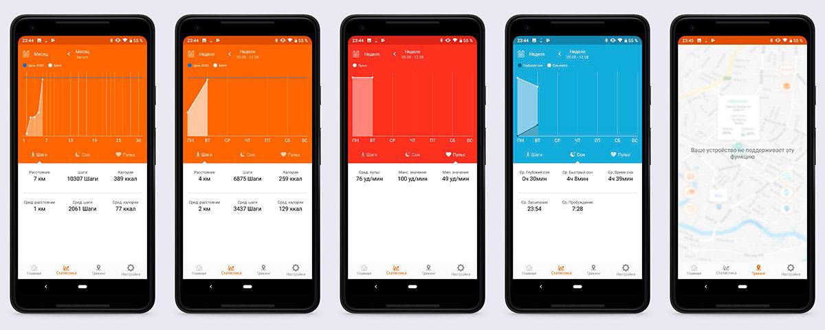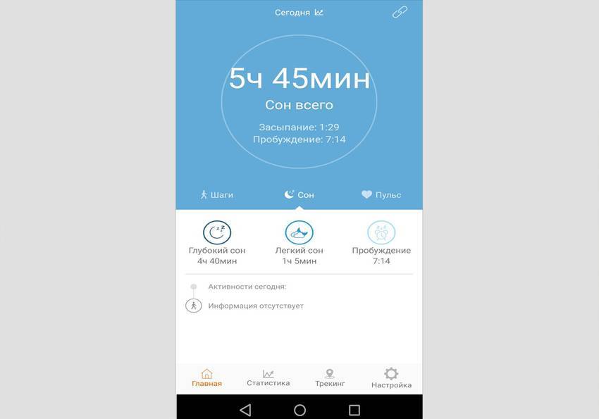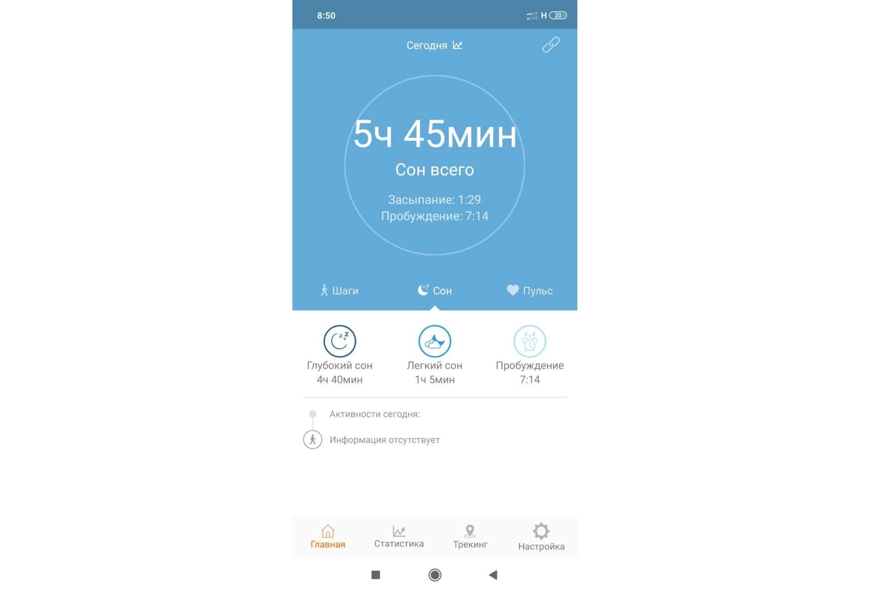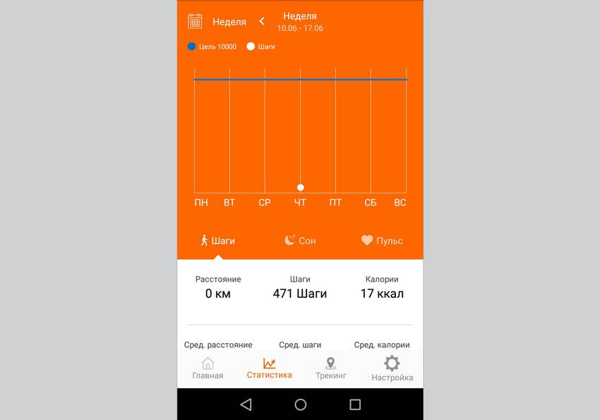 Вторая вкладка со статистикой содержит сводную статистику по вашей активности (шаги, сон и пульс) за определенный период: неделю, месяц или год. Третья вкладка под названием «Трекинг» говорит нам ровным счетом ни о чём. Устройством эта функция попросту не поддерживается. Возможно она разработана для будущих устройств, которые будут укомплектованы GPS-модулем.