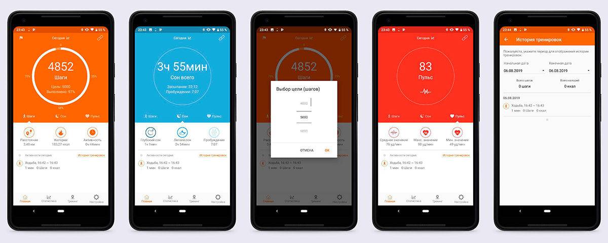 Вся информация об активности представлена на первой же вкладке — количество шагов, цель, расстояния и тренировки. Флажок в левом верхнем углу позволяет установить цель. Ниже можно переключатся между шагами, сном и пульсом, просматривая некоторую информацию по каждому из них. Приложение отображает длительность глубокого и легкого сна, а также время пробуждения. В меню с пульсом — текущий, средний, максимальный и минимальный за день.