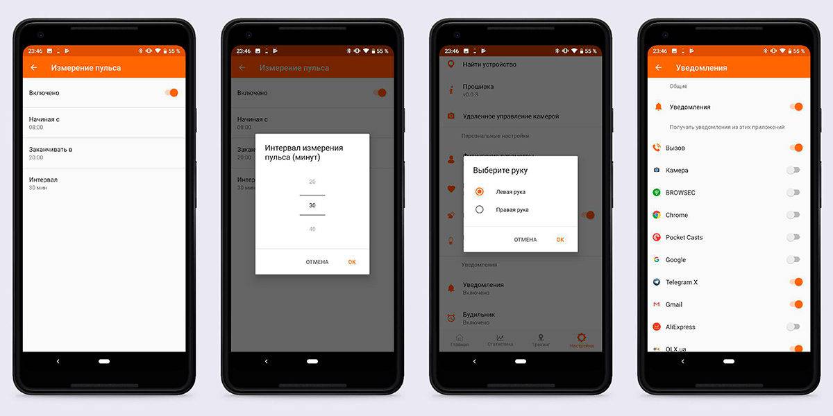 Можно указать собственные физические параметры для точности измерений и тонко настроить измерение пульса. Это вообще отлично, я считаю, ведь лично меня мало интересует пульс ночью, измерение которого только зря расходует батарейку. А так — выбрал период с интервалом и всё. Разумеется, для точности подсчета шагов нужно выбрать ту руку, на которой вы будете носить Canyon CNS-SB41.