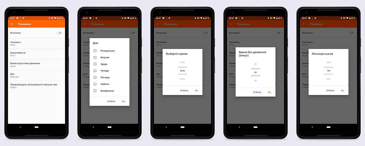 Вот в пункте «Разминка» (трекер будет «пинать» вас, если вы долго не двигаетесь) поступили грамотно. Мало того, что можно выбрать время (например, когда вы на работе), так ещё и указать, по истечении скольких минут без движения напоминать об необходимости подвигаться и даже выбрать дни срабатывания напоминалок. Помимо этого, позволяется ещё и установить, сколько минимум шагов вы должны сделать после напоминания. Ну здорово, реально.