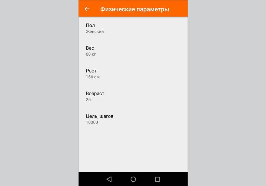 При первом запуске приложения вам нужно заполнить информацию о себе: пол, возраст, рост и вес. Это поможет собирать более детальную информацию о ваших спортивных успехах в будущем.