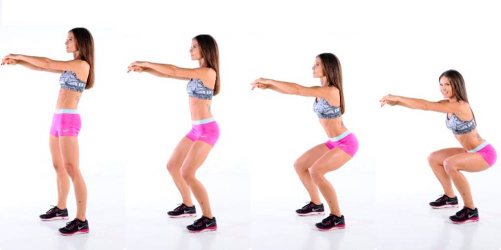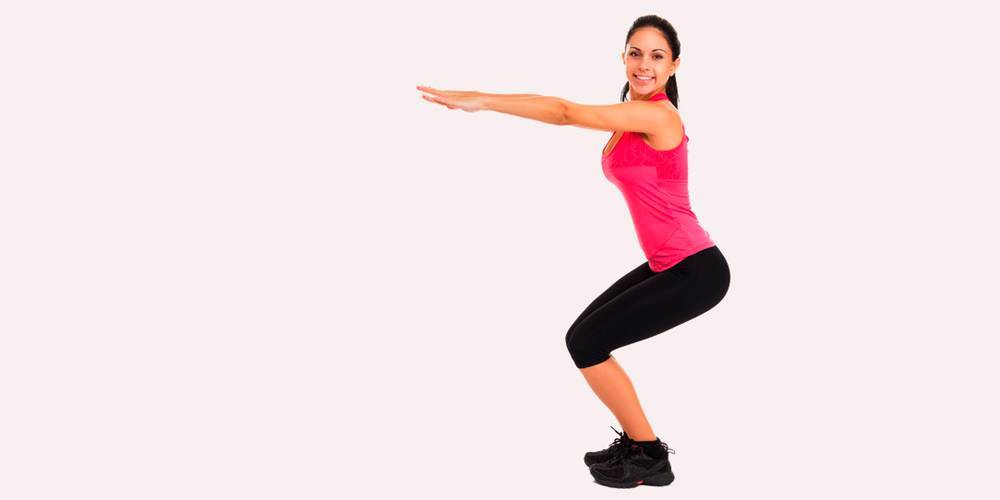 Поставить ступни параллельно друг другу на расстоянии 1 м, медленно присесть, стремясь к параллели бедра с полом. Колени внутрь не заваливать. Руки можно вытянуть вперед. Нужно научиться выдерживать позу 1-3 минуты.