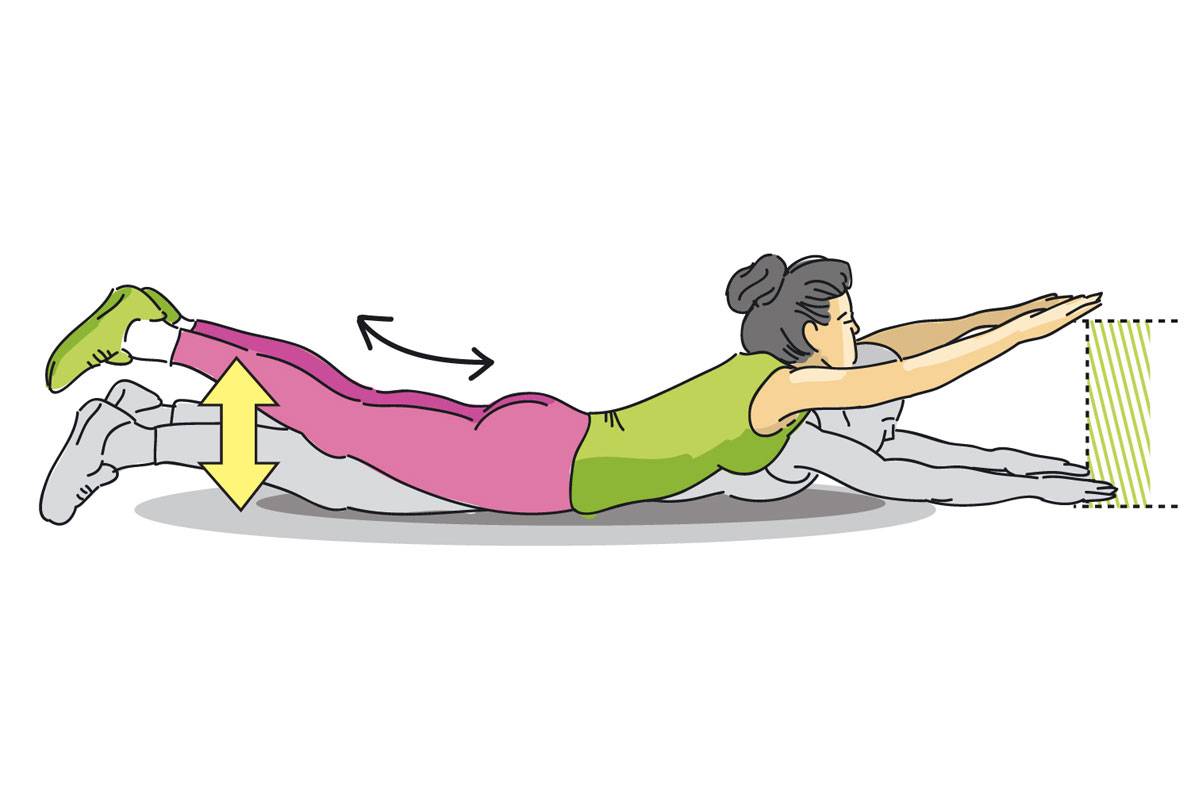 Исходное положение — лежа на животе, руки и ноги вытянуты. Напрягите пресс, втяните живот, затем медленно приподнимите руки и ноги примерно на 30-40 см вверх. Задержитесь на 1-2 секунды и вернитесь в исходное положение. Выполните 3-4 подхода по 8-12 повторений.