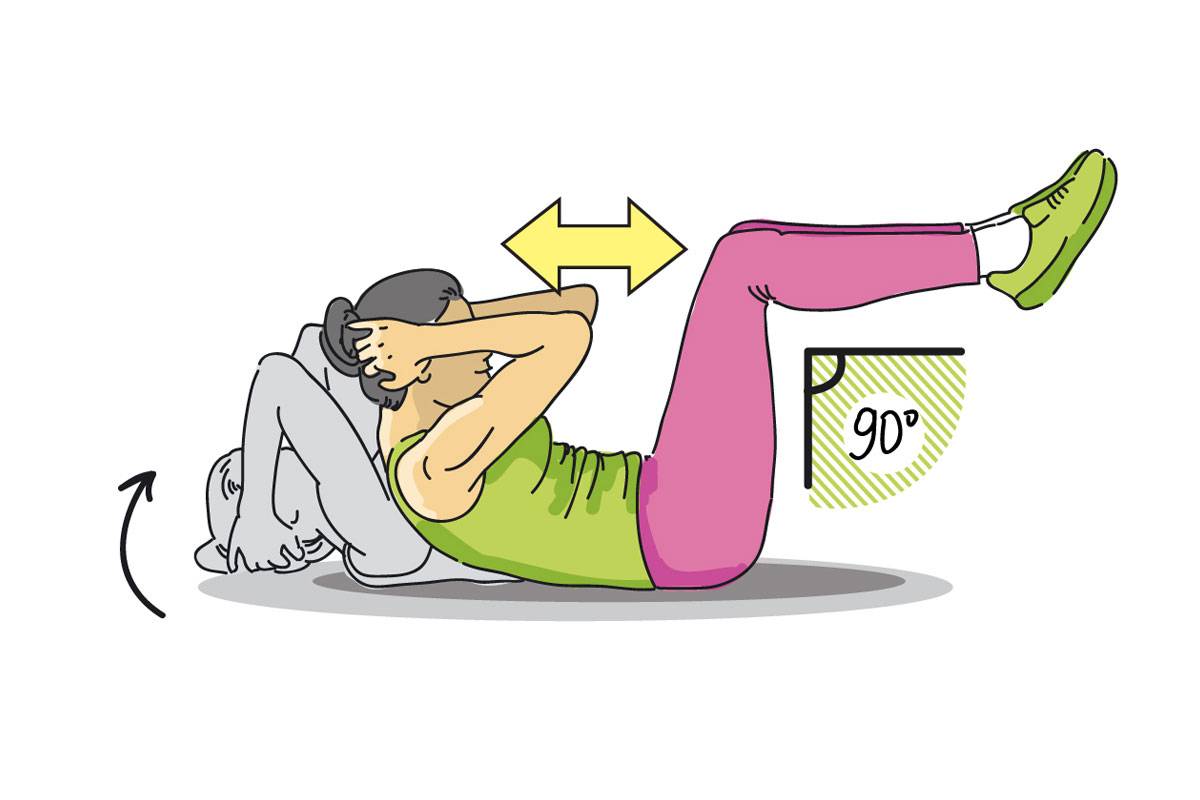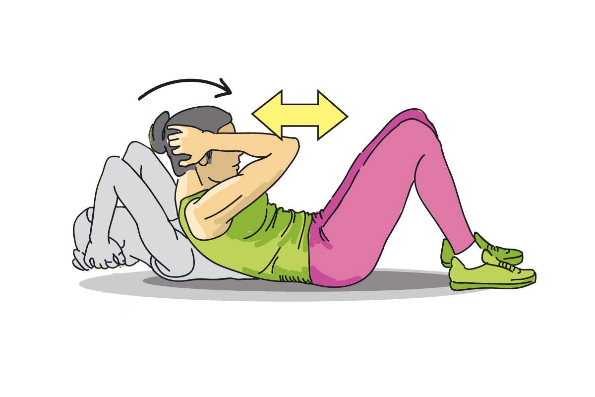 Исходное положение — лежа на спине, одна согнутая в колене нога на полу, другая заложена вверх. Руки за головой — однако без чрезмерного давления. На выдохе медленно тянитесь локтем к противоположному колену, сокращая пресс. Выполните 2-3 подхода по 12-15 повторений на каждую сторону.