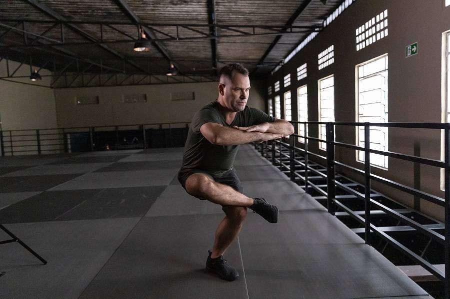 - После этого приступают к приседанию. В процессе следует контролировать положение колен, чтобы они не выходили за границу носков. Таз нужно отводить назад, а корпус наклоняется немного вперед. Присев, нужно тут же подниматься. При этом не нужно бояться, что потеряется равновесие.