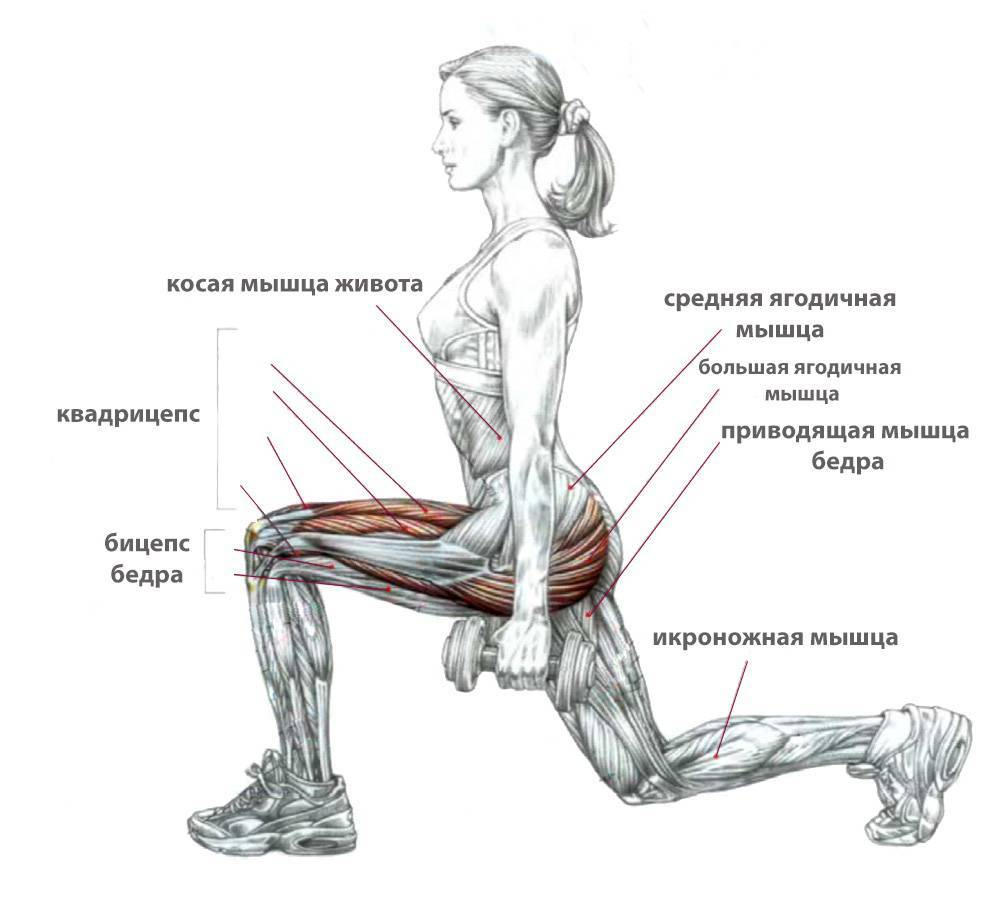Выпады с гантелями — комплексное упражнение, основная нагрузка при выполнении которого приходится на квадрицепсы, бицепсы бедер, большие ягодичные, икроножные мышцы. Для лучшей координации, поддержания равновесия к ним подключаются стабилизаторы — широчайшие, ромбовидные, трапециевидные мышцы спины, брюшной пресс. Когда упражнение выполняется с отягощением (гантелями, грифом), статическая нагрузка приходится на плечи, предплечья, запястья.