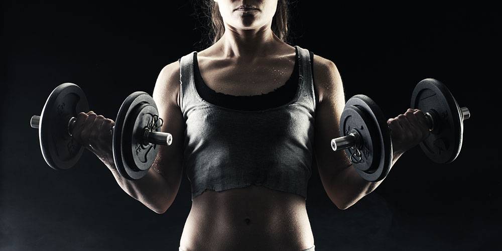 - Встаньте прямо, держа гантели в каждой руке (ладони обращены в сторону ваших ног).