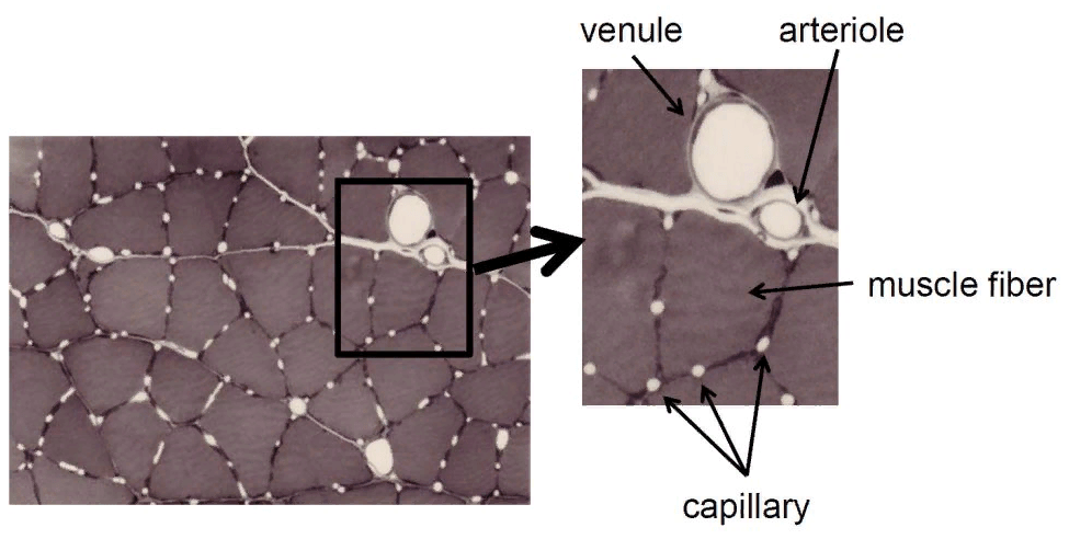 Фото микроскопом: волокна на срезе мышцы, окруженные капиллярами