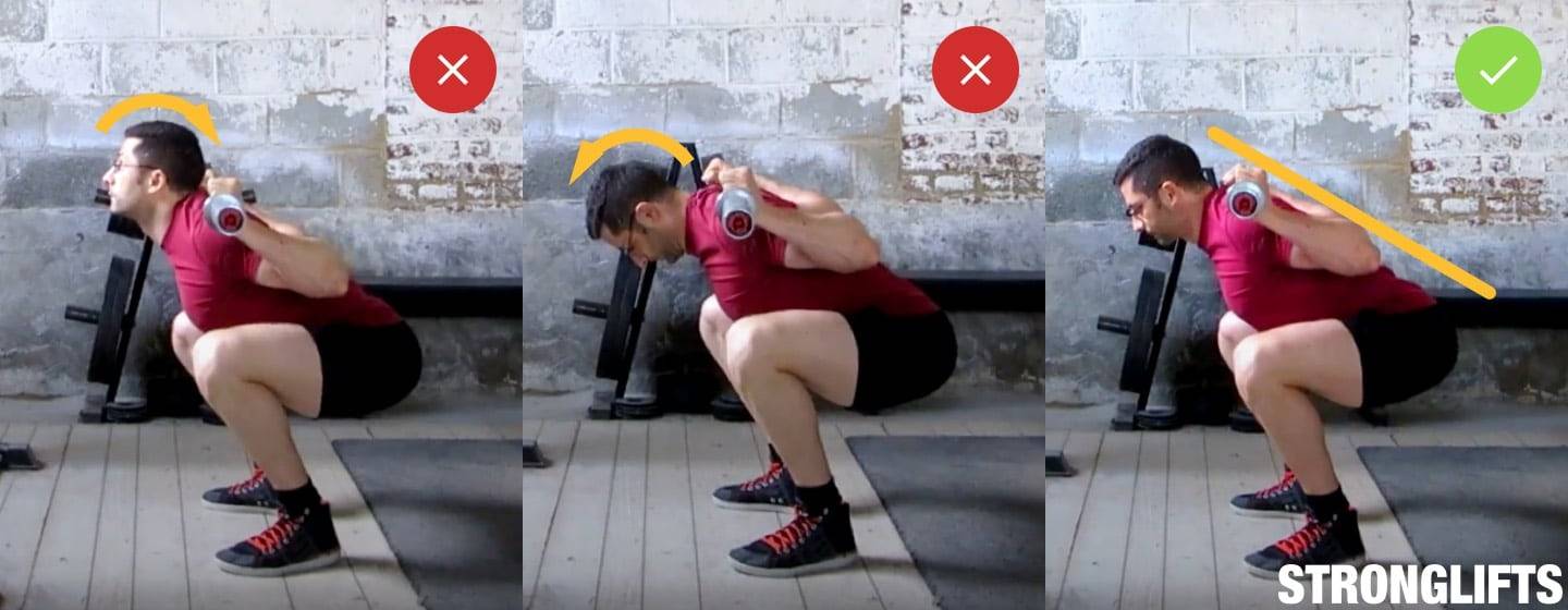 В нижней точке движения необходимо поддерживать позвоночник в идеально прямом положении — для этого взгляд должен быть направлен в точку на полу примерно в одном метре от вас. Избегайте соблазна крутить головой в попытках контролировать правильность выполнения упражнения в зеркале — это может спровоцировать боли в шее.