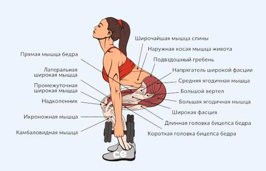 - в меньшей степени задействуются мышцы спины, икр, пресса;
