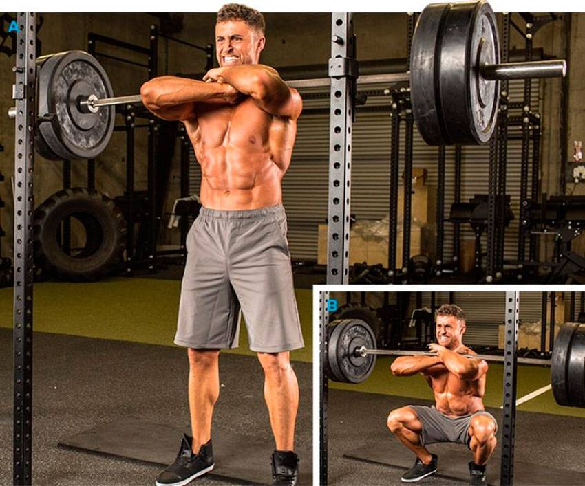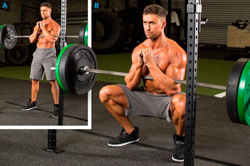 - Штанга на груди. Благодаря положению штанги спортсмен не сможет наклониться вперед, как результат – корпус будет стоять вертикально, что позволит изолировать квадрицепс без включения ягодиц в работу.