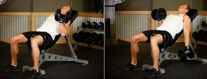 Лягте грудью на наклонную скамью. Держите гантели перед собой параллельно полу. Выполняйте тягу гантелей груди. Вы почувствуете как работают мышцы верхней части спины. Опустите гантели и повторите необходимое количество раз.