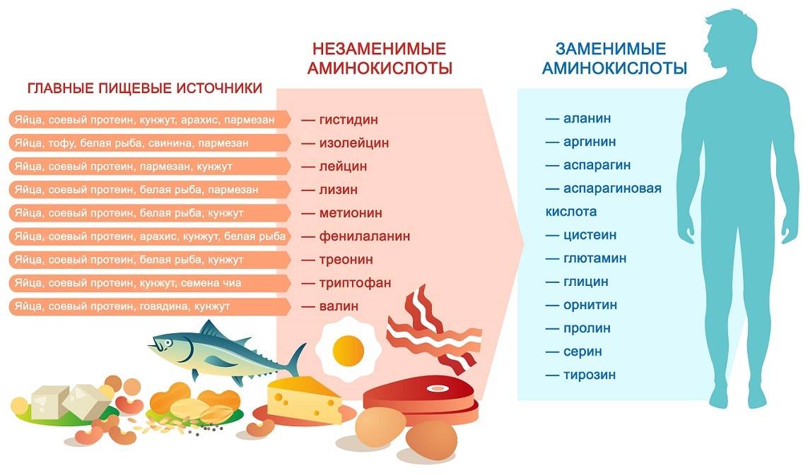 Белки состоят из цепочки аминокислот, которые тело использует для различных нужд. Одни аминокислоты поступают только с пищей, другие организм создает сам. Всего существует 20 аминокислот, разделенных на 2 группы: