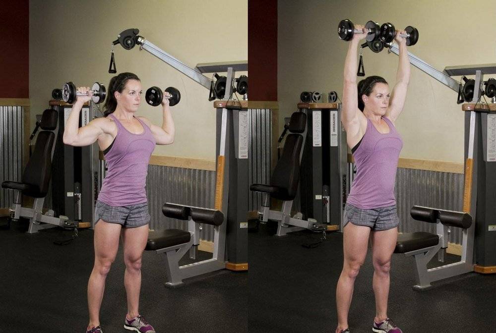 Жим стоя с использованием гантелей имеет цель проработку плеч, а не трицепсов