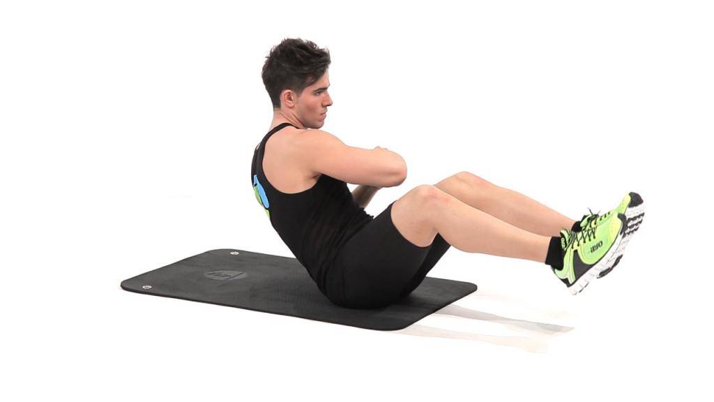 Сядьте на пол, корпус отклоните назад, ноги слегка согните в коленях и поднимите над полом. Руки сложите ладонями друг на друга. Поверните корпус в правую сторону и опустите ладони к полу. Не возвращаясь в исходное положение, поверните корпус влево и снова опустите руки вниз. Упражнение не только прорабатывает косые мышцы живота, но также тренирует выносливость.