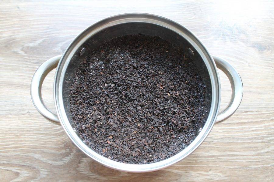 Налейте в кастрюлю воду, добавьте соль, сахар и насыпьте черный чай.