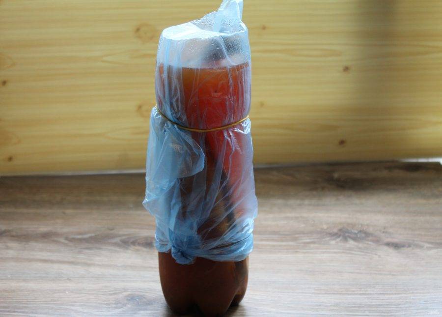- Сверху бутылку накрывают пищевой пленкой или пакетом, тщательно замотав его вокруг. Посередине делают небольшое отверстие.