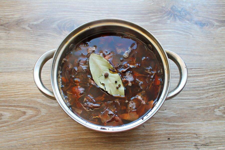Снимите с огня, добавьте лавровый лист, перцы, перемешайте. Накройте крышкой и оставьте до полного остывания.