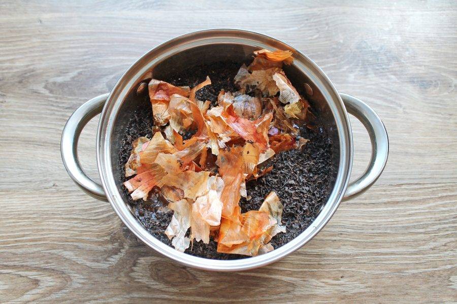- Наберите в кастрюлю 1 л воды и поставьте кипятить. Всыпьте 2 горсти промытой луковой шелухи.