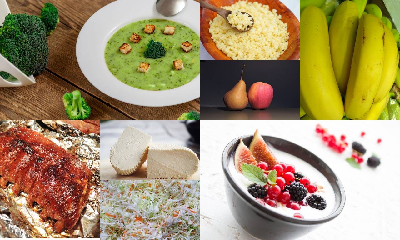 | Пшено на воде, йогурт нулевой жирности, фрукты. | Яблоки и груши. | Салат из капусты и нежирная свинина, запеченная в фольге. | Бананы. | Кусочек адыгейского сыра, брокколи, суп. |