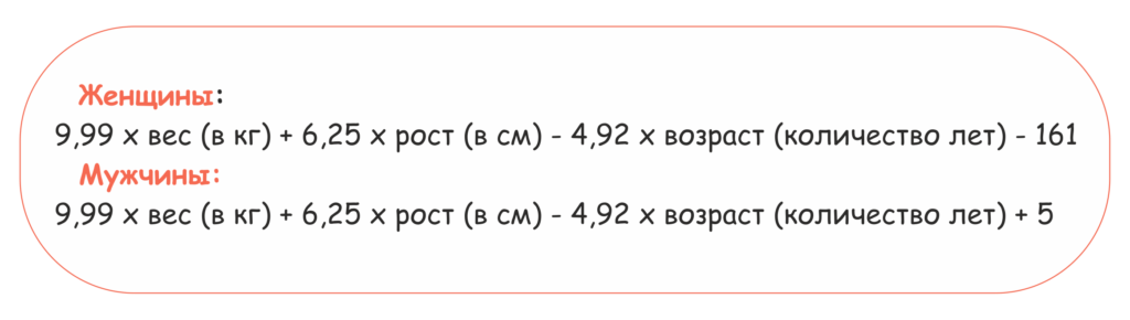 - Для женщин: 0,9*вес(кг)*24=кол-во ккал/сутки.