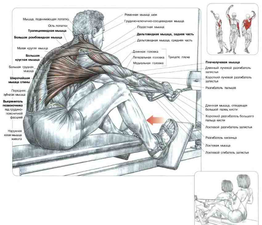 При выполнении тяги на нижнем блоке задействованы практически все мышечные группы спины и целый ряд синергистов, включая: