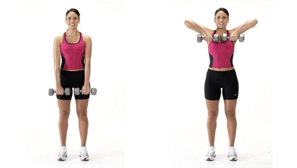 Отлично подойдут для девушек и новичков. Техника выполнения тяги гантелей к подбородку абсолютно идентична штанге: