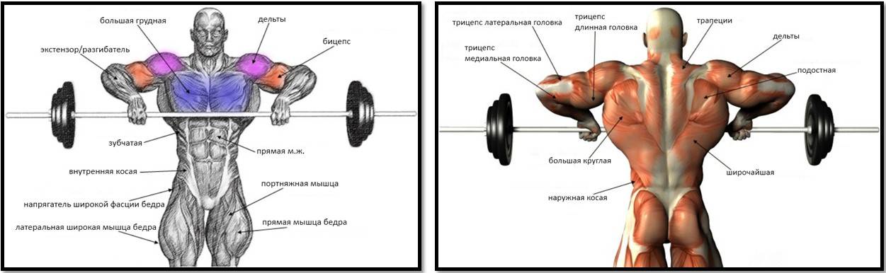 - При узкой постановке рук на гриф в работу в большей степени вовлекаются трапециевидные мышцы и бицепс.