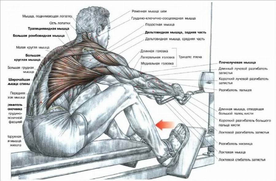 В её выполнении участвует практически весь верх тела. При технически правильной работе значительную нагрузку берут на себя широчайшие мышцы спины. В качестве вспомогательных активируются: