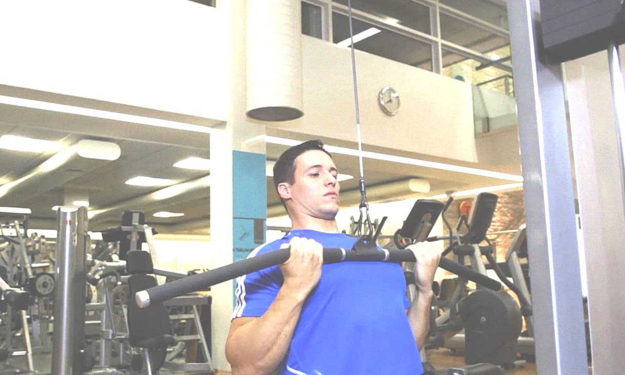 - Установите на верхнем блоке широкую рукоять, обхватите ее сверху широким хватом.