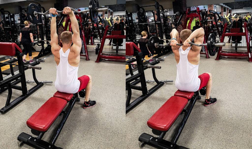 - Если слегка отклонить руки с грифом от вертикали, воздействие на трицепс усилится, но в верхней его части.
