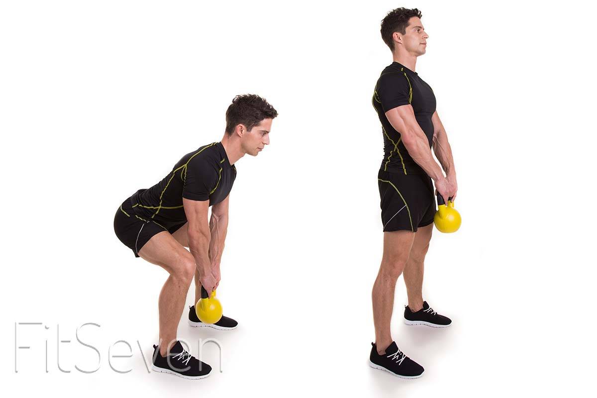 Вариация классического силового упражнения, выполняемая с гирей. Исходное положение – ноги чуть шире плеч, ноги в полуприседе. За счет силы мышц ног поднимитесь вверх, сохраняя позвоночник прямым, а пресс напряженным. Во время выполнения упражнения грудь выставлена вперед, плечи раскрыты.
