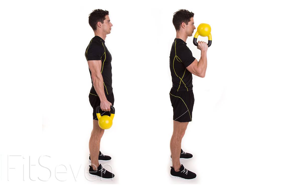 Изолирующее упражнение для развития мышц рук. Исходное положение: стоя ровно, ноги на ширине плеч, гиря зажата в одной руке. Держа пресс напряженным и сохраняя естественный прогиб поясницы, медленно поднимите вес вверх, следя за тем, чтобы локоть не уходил вперед.