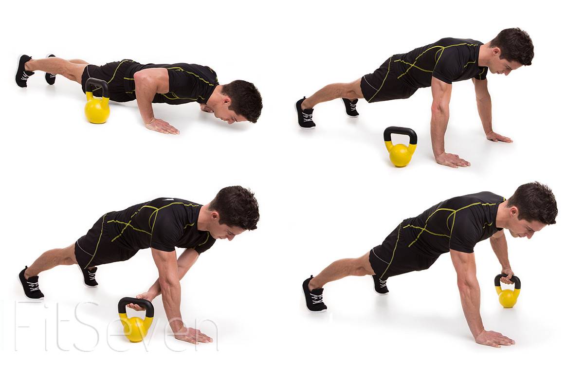 Исходное положение — нижняя точка отжиманий. Поднимите тело вверх, сохраняя позвоночник прямым. Возьмите гирю левой рукой (правая рука на полу) и, держа пресс напряженным, переместите гирю в сторону. Повторите для другой руки.