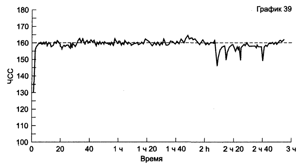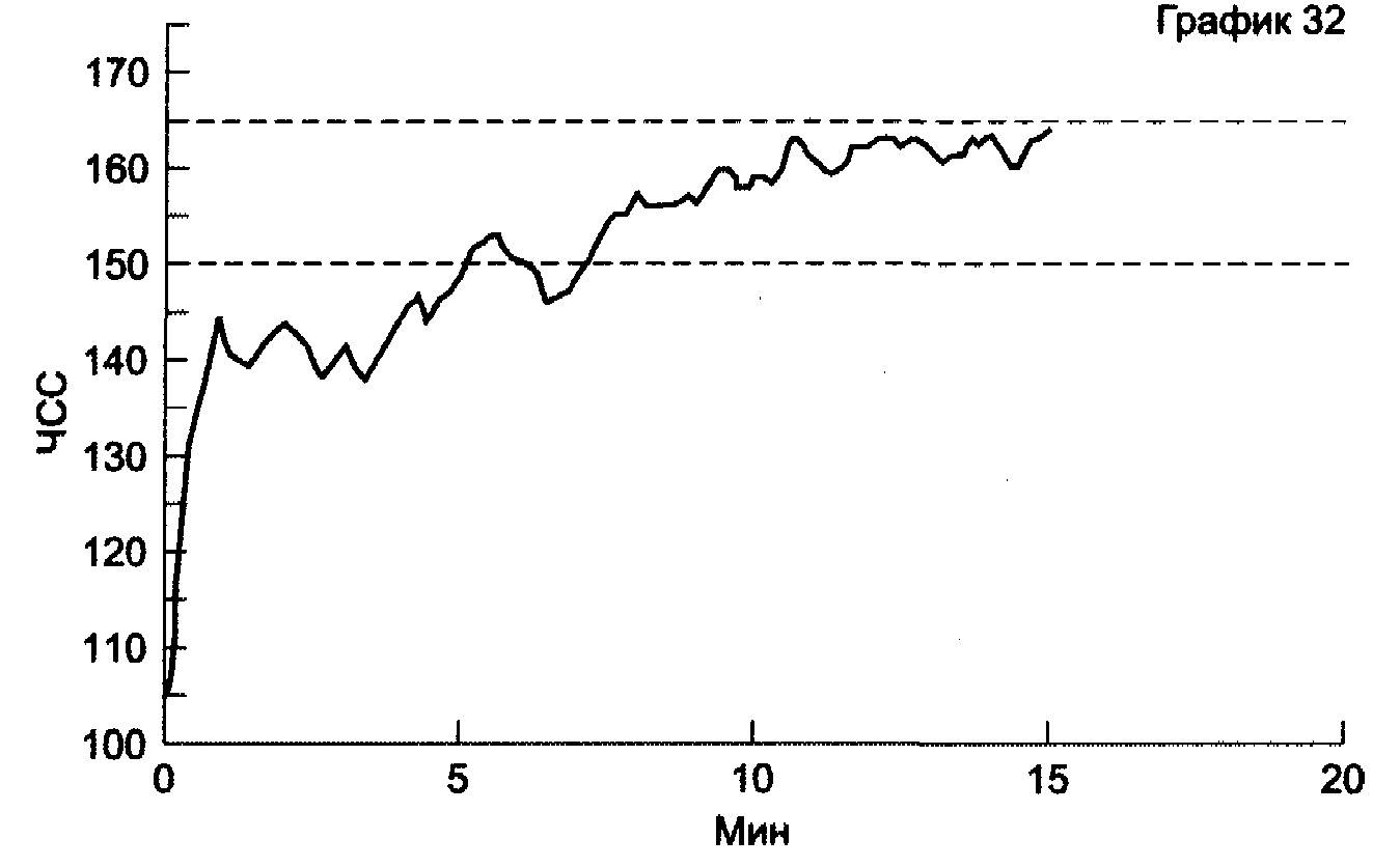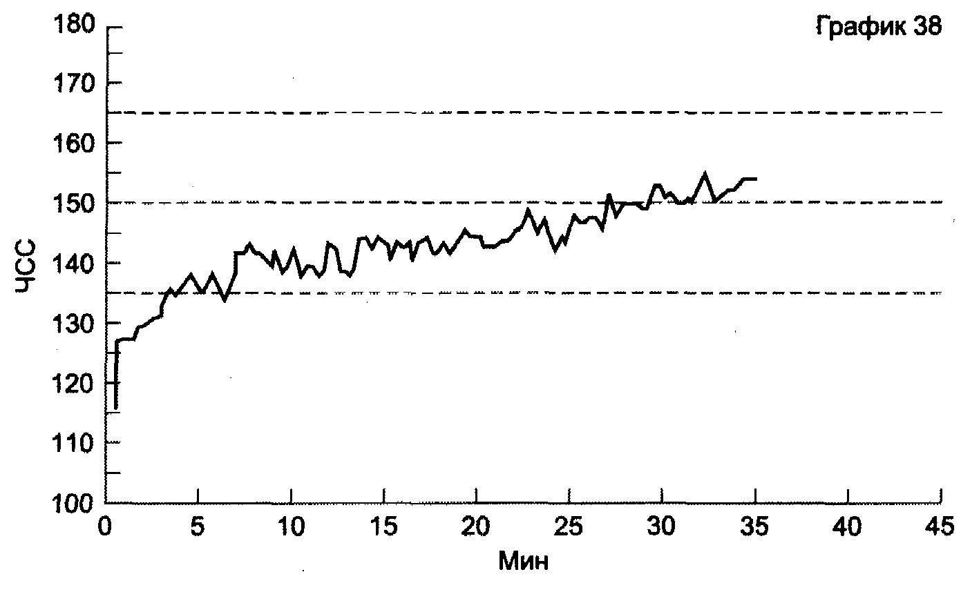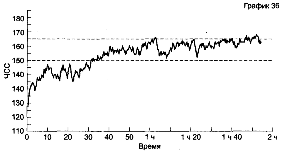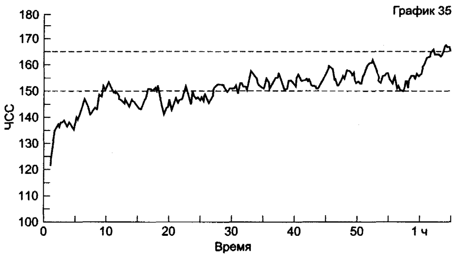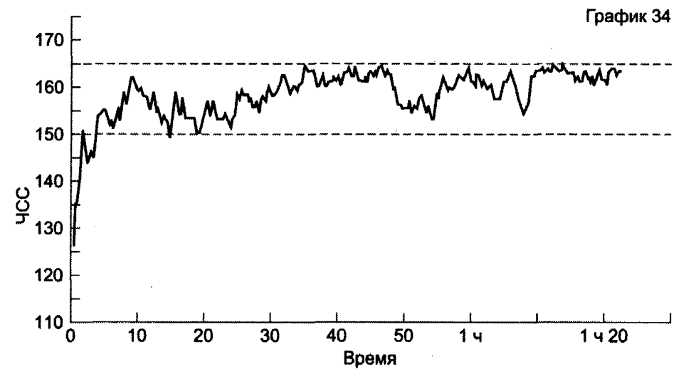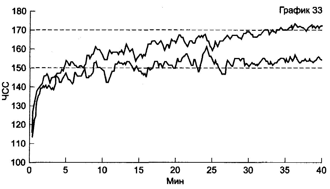 График 33 (верхняя кривая). День 4. Раннее утро. Бег в умеренном темпе (13-14 км/ч) 40 минут. ЧСС выше обычной. После 30 минут работы ЧСС 170 уд/мин — анаэробный порог.