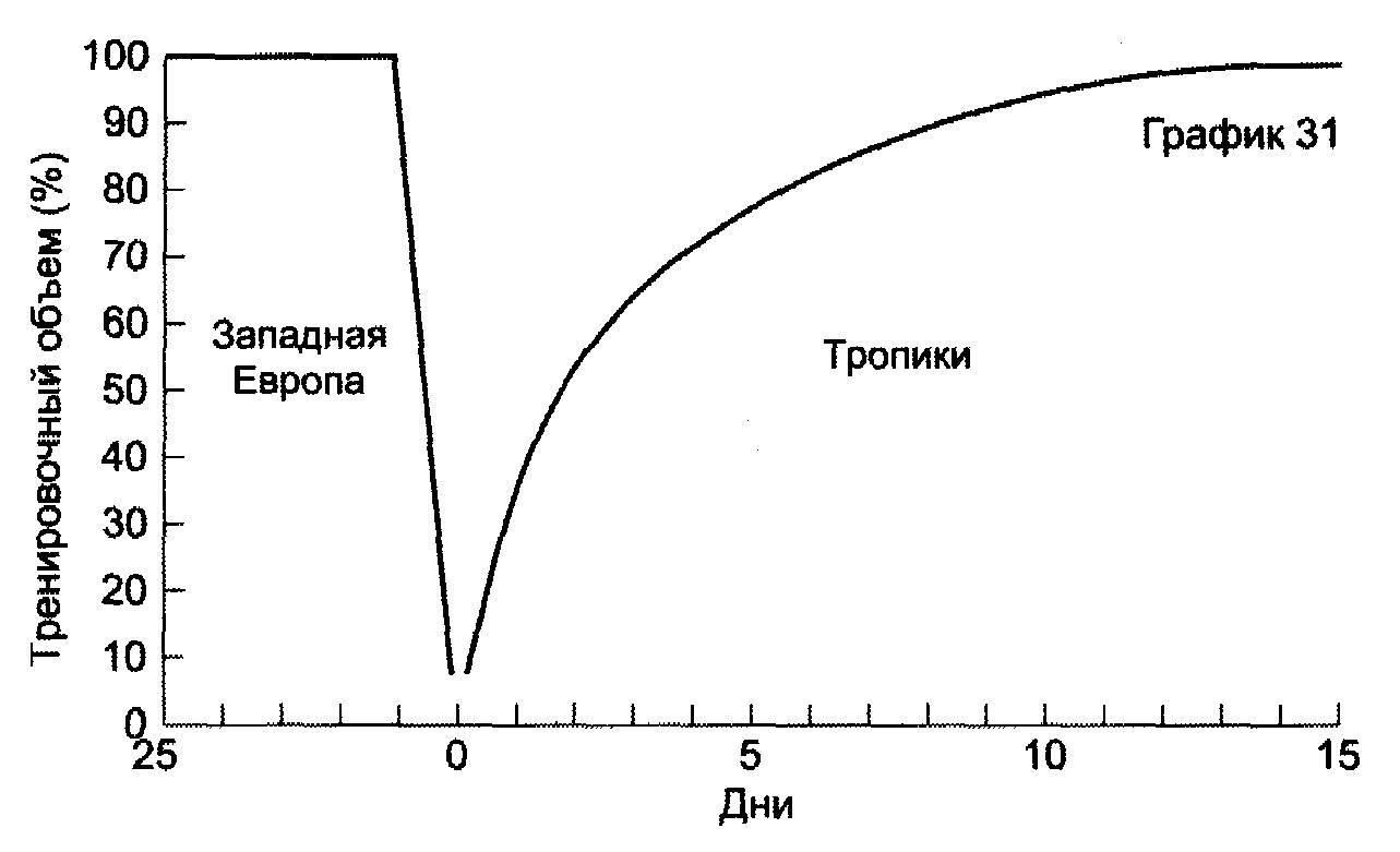 График 31. Влияние жарких и влажных условий тропиков на работоспособность. Выполнение обычной тренировки в первые дни после приезда невозможно. Падение работоспособности первых дней компенсируется после акклиматизации.
