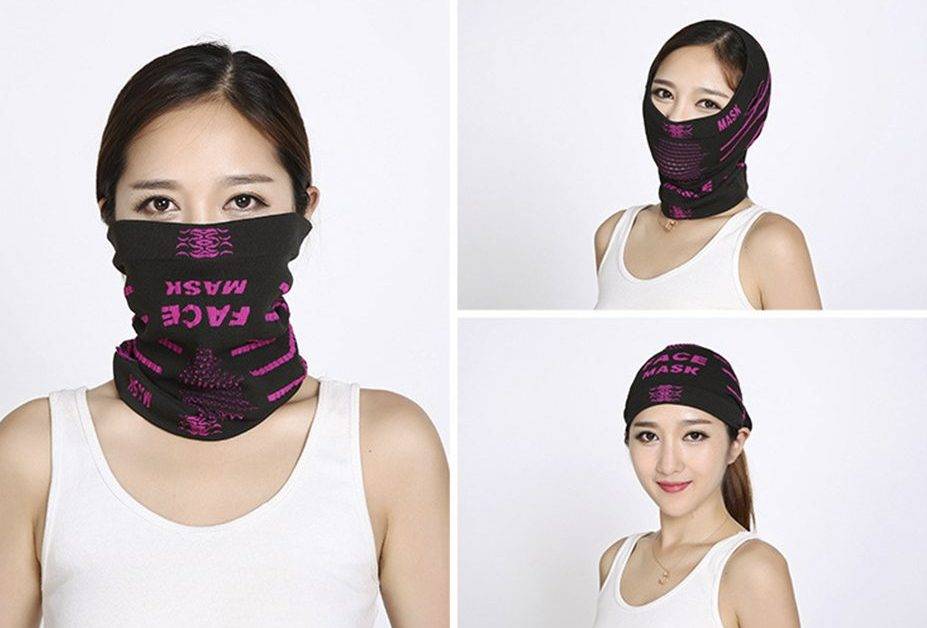 - Баф. Так называется маска-трансформер. Ее можно носить на голове, закрывая волосы, лоб. А можно надеть на шею, натянув до уровня глаз.