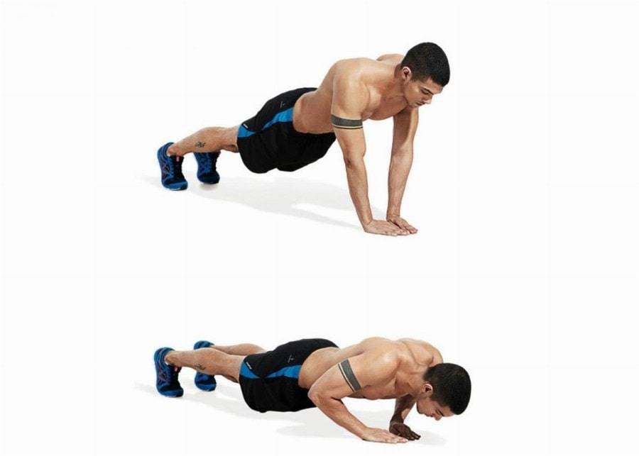 - Приподнимите таз над полом, не касаясь ягодицами при отжиманиях.