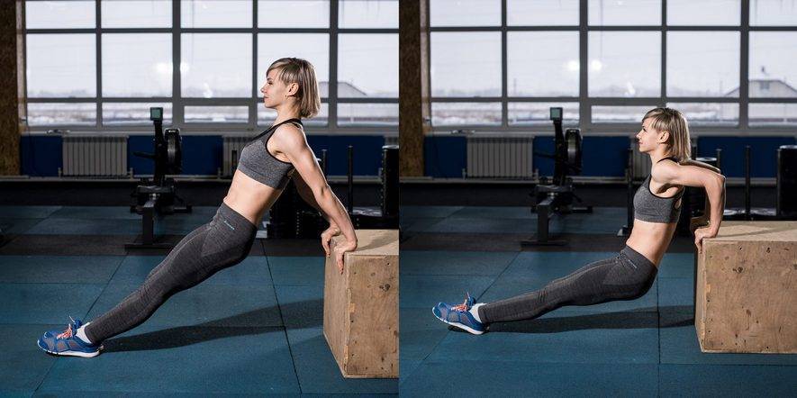 У обратных отжиманий не так много вариаций, их всего лишь несколько, если не считать положение рук и ног. Стоит отметить, что экспериментировать с шириной хвата и постановкой ног – удел опытных спортсменов. А мы поговорим о нескольких вариациях, которые облегчат или, наоборот, усложнят выполнение упражнения.