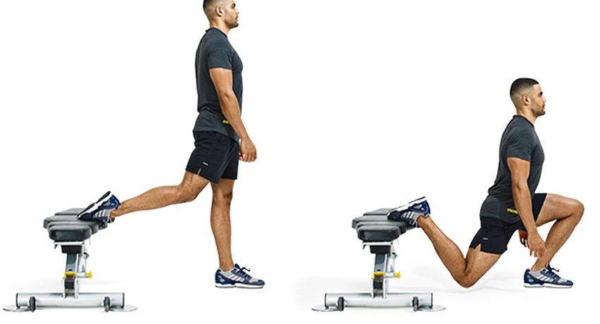 - Встаньте спиной к платформе или стулу высотой до колен. Согните одну ногу и положите ступню на платформу позади вас. Отпрыгните вперед на одной ноге и опуститесь в подсед в позу “ножницы”.