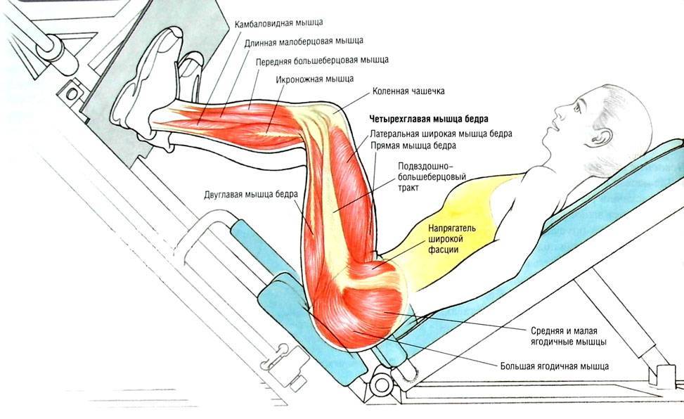 - Жим ногами с высокой постановкой ног — 3 подхода по 10-15 повторений;