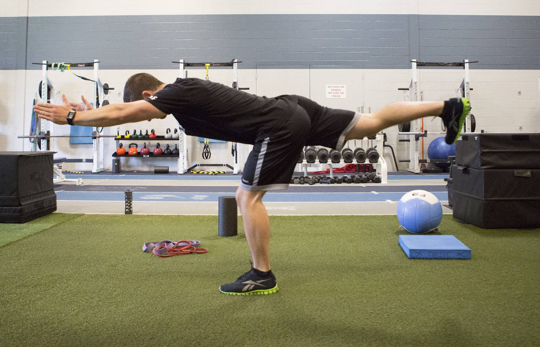 Это упражнение тренирует ягодицы и мышцы задней поверхности бедра, и, как большинство движений, выполняемых стоя на одной ноге, оно помогает научиться держать равновесие. Встаньте у стены, если считаете, что в ходе выполнения вам потребуется дополнительная опора.